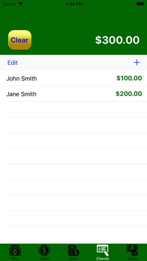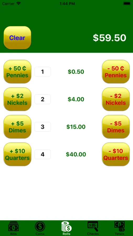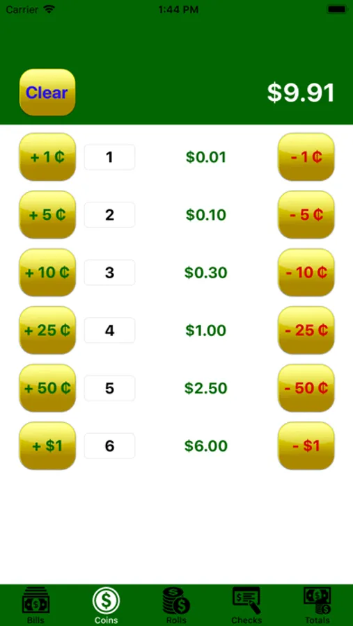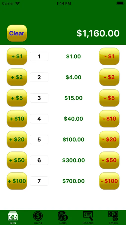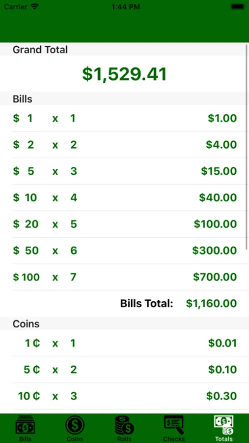 Counts bills, coins, coin rolls and checks! Just enter the amount for each denomination and the app does the calculations.