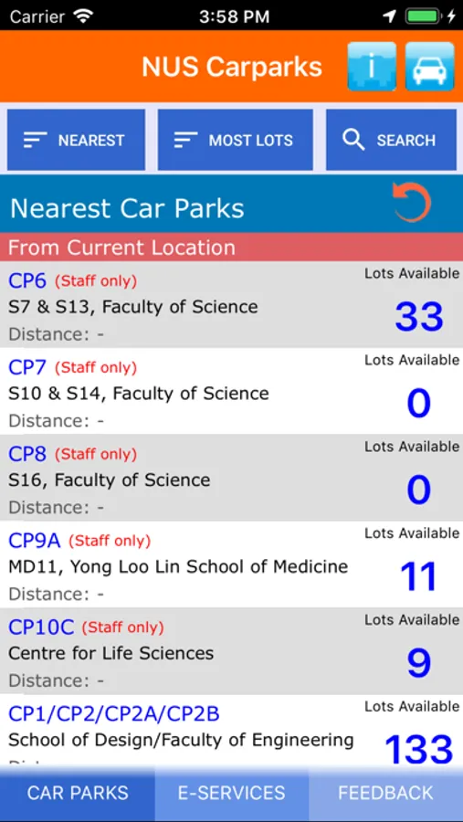 • List of carparks in the campus with location maps as well as real time information on the number of parking lots available.