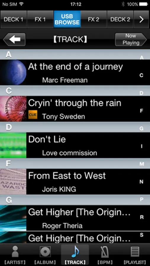 The tracks on a USB device connected to the DJ device can be browsed and selected on the iPad, iPhone or iPod Touch, and playlists can be created and edited.