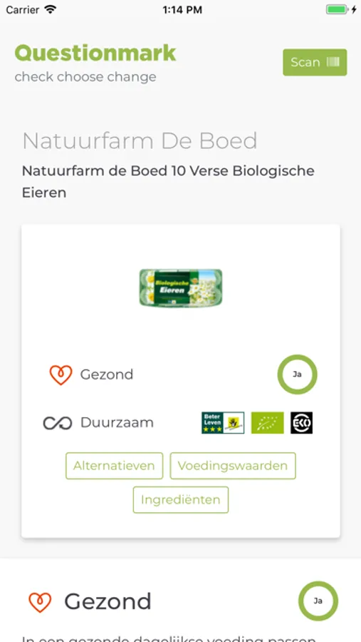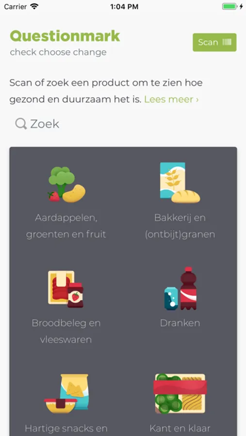 Wil je duurzaam en gezond boodschappen doen? Questionmark helpt! De gratis app laat je zien welke (top)keurmerken een product heeft op de duurzaamheidsthema’s milieu, mensenrechten en dierenwelzijn. Daarnaast beoordeelt de app of het product binnen een gezond voedingspatroon past. Je kunt producten scannen of opzoeken.