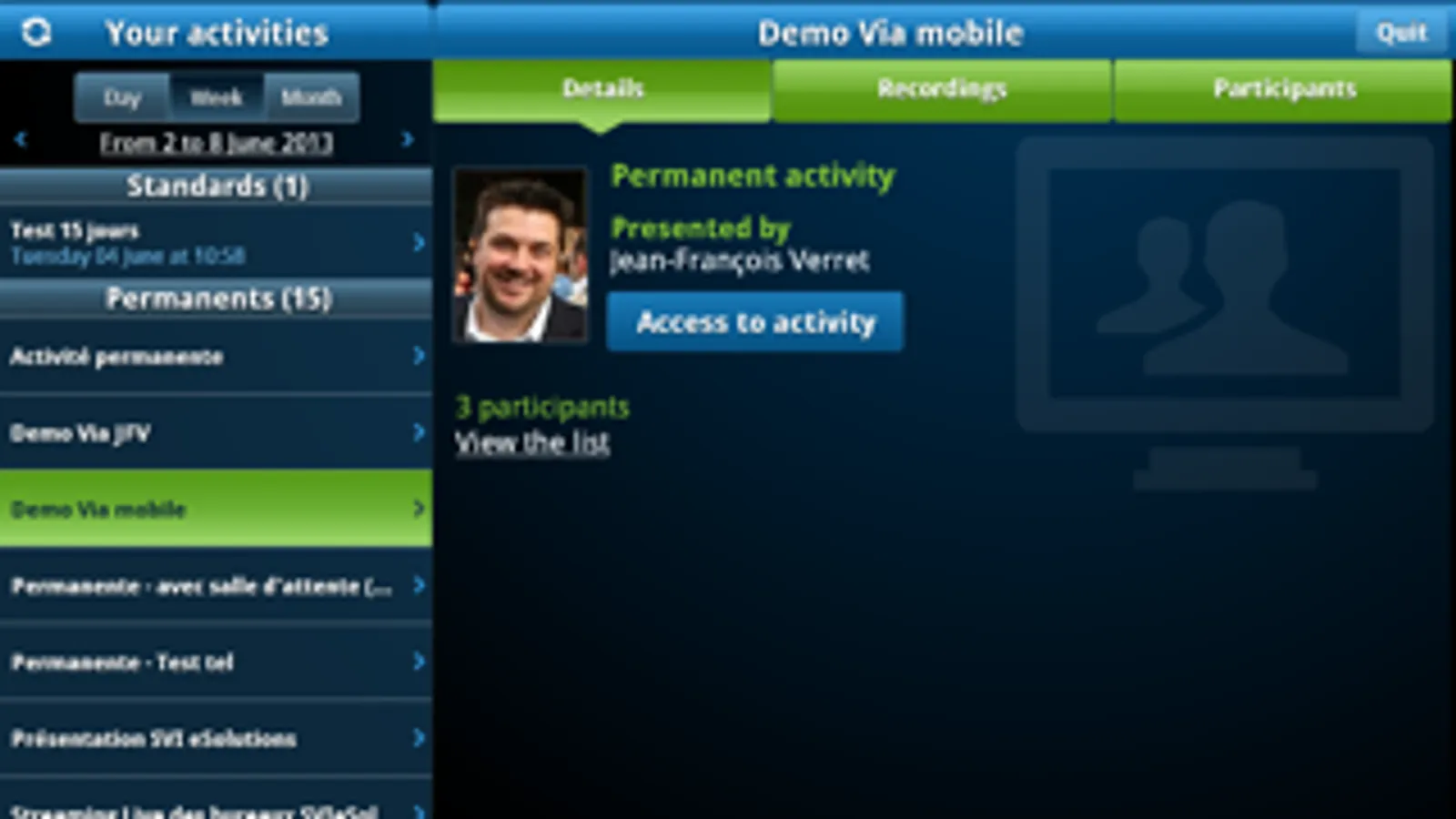 Via’s collaborative suite allows you to enjoy very friendly, experienced and multilingual Web conferencing and training environments. With the power of a Cloud offer and the security of RISQ hosting, it deploys rapidly without requiring installation while leaving you in control of your user accounts and your content. ViaMobile simplifies your communications and your technical problems while going through firewalls and security networks. You are thus free to participate with your clients, employees and collaborators at your meetings and distance learning and this, wherever they are located.