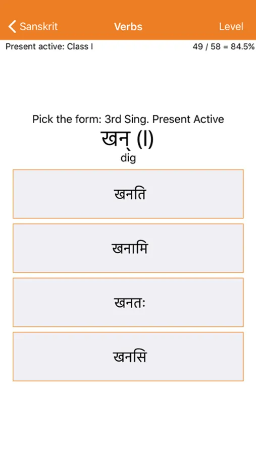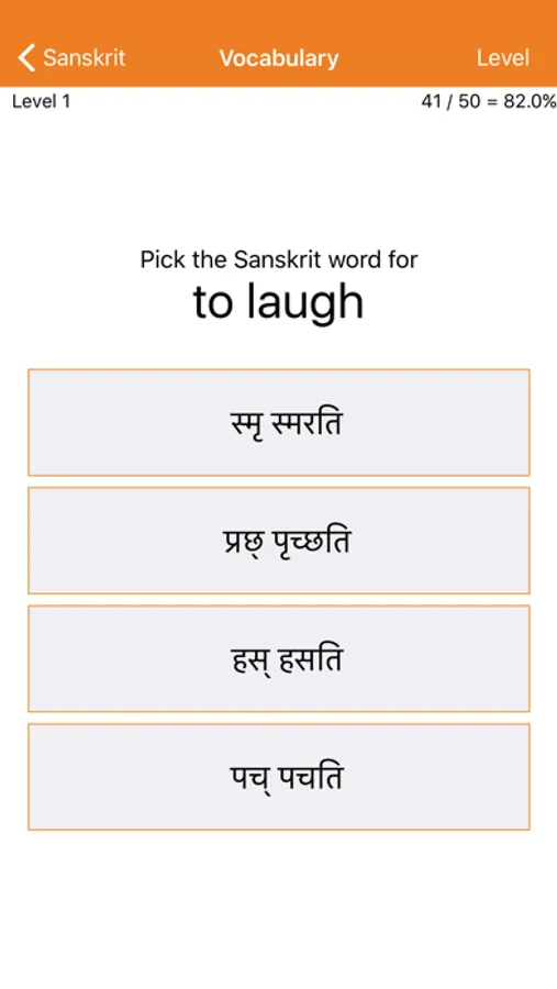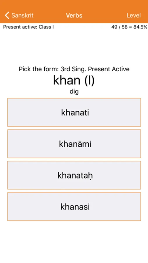 Whenever you have your phone and a free moment, Liberation Philology Sanskrit presents a continuous multiple-choice test on Sanskrit vocabulary and grammar. It immediately confirms or corrects each answer, and reinforces your knowledge through repetition.