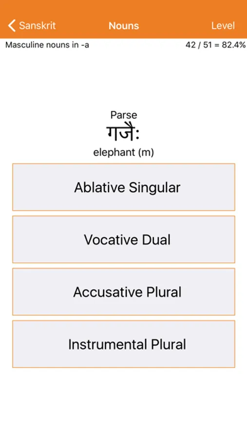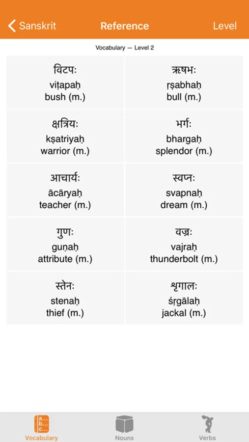 • Vocabulary: 320 levels, each testing the translation of ten words between Sanskrit and English. Interspersed among these are cumulative levels reviewing what has been learned earlier (giving a total of 360 levels).