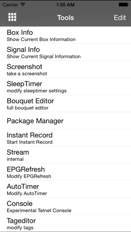 Full channel list for each bouquet, search channels, show EPG for each channels, list now + next event or 3 different primetimes, automatically load channel picons, zap to channel, stream to iDevice.