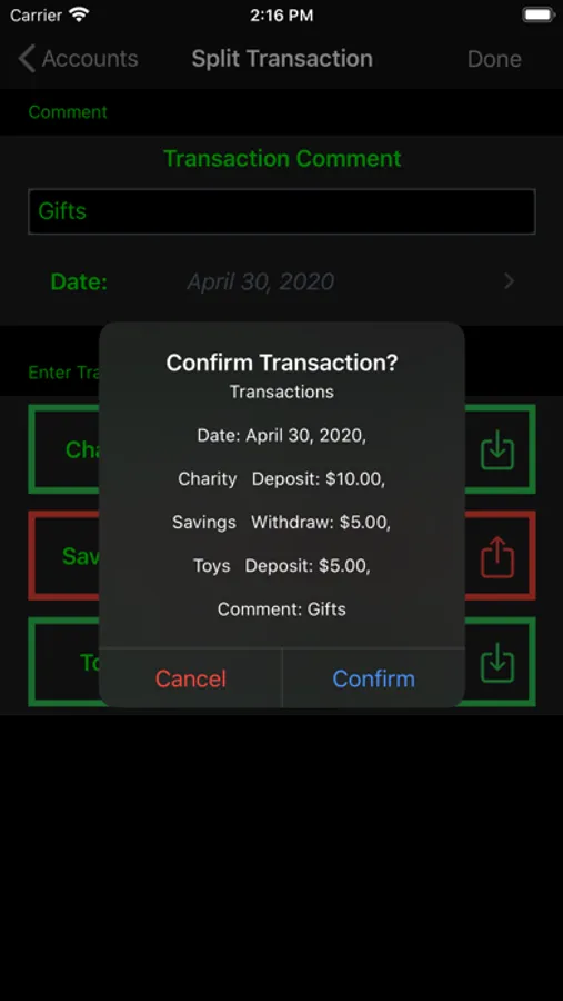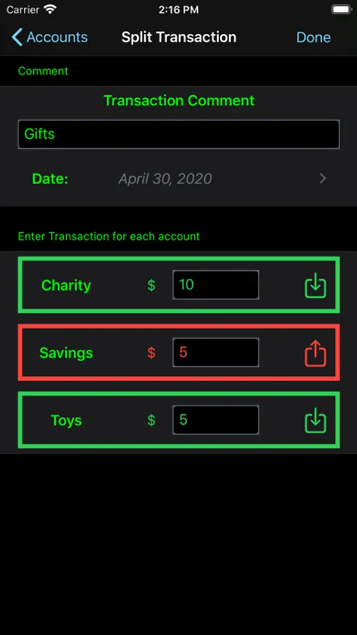 •Split deposits or withdrawels between accounts (savings, charity, fun)