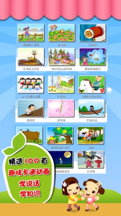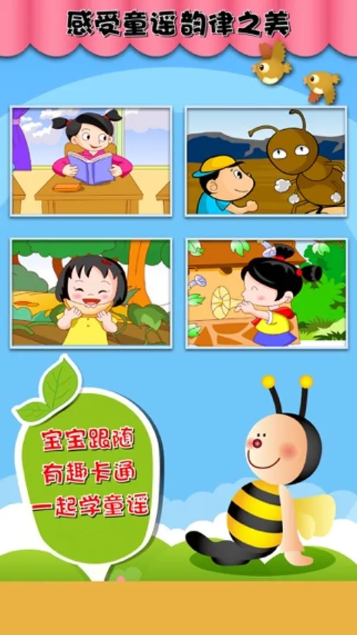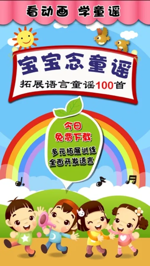精选最耳熟能详、最易唱诵的百首经典童谣。优美动听的旋律,生动有趣的卡通动画,在这样轻松愉快的环境下,宝宝可以零距离聆听、吟唱趣味益智的经典童谣,带来的无限欢乐。让宝宝在律动的音乐中开启语言智能、启迪智力、激发潜能,使宝宝在音乐的熏陶下快乐健康地成长。