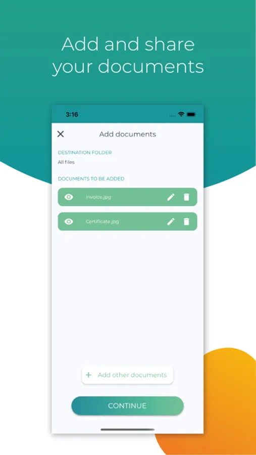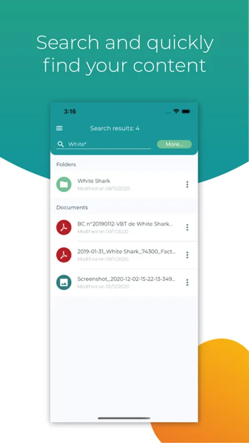 • Save your files, photos and videos, file them directly from your smartphone or tablet and share them with your employees, customers and suppliers