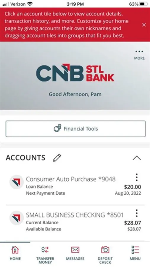 CNB St. Louis Bank’s digital banking app securely connects you to your accounts from anywhere at any time! With this app, you can: