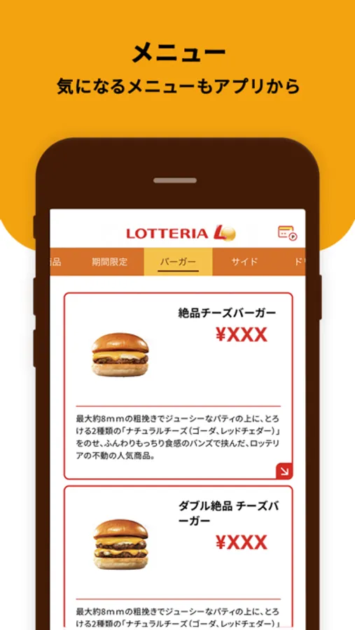 期間限定メニューやハンバーガー、サイドメニュー、ドリンクなどのメニューをご覧いただけます。