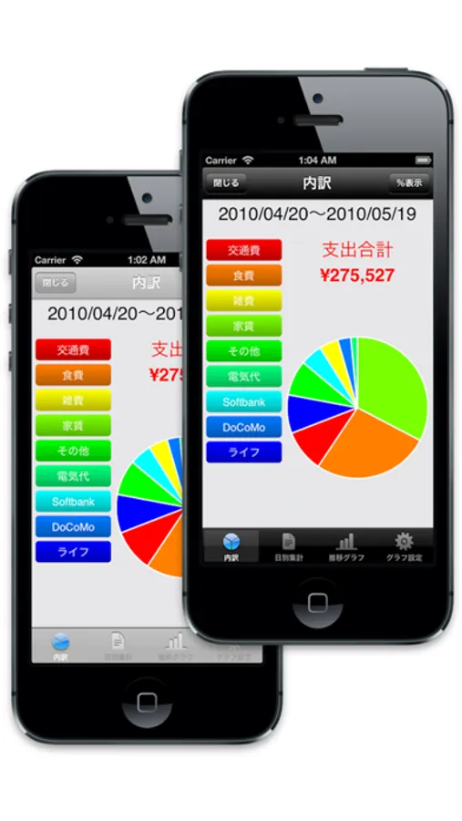 ・円グラフ:収入と支出の内訳が円グラフとして表示。