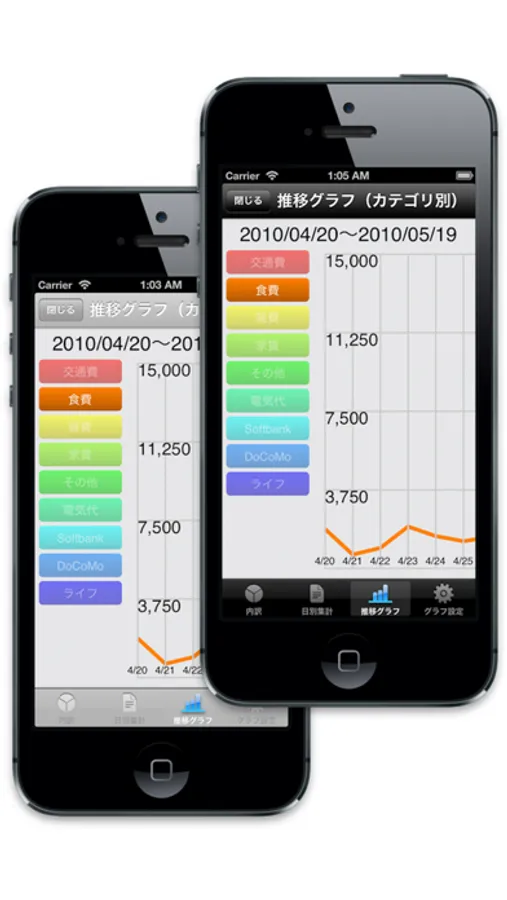 ・グラフの表示、非表示:推移グラフにて項目のラベルをタップすることで、タップされた項目のグラフが表示、非表示されます。