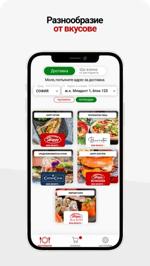 Through the mobile application of Happy, you can order meals from our restaurants in Varna, Sofia, Burgas, Plovdiv or Ruse.