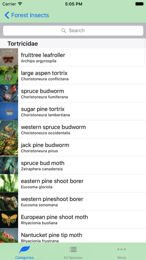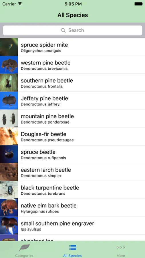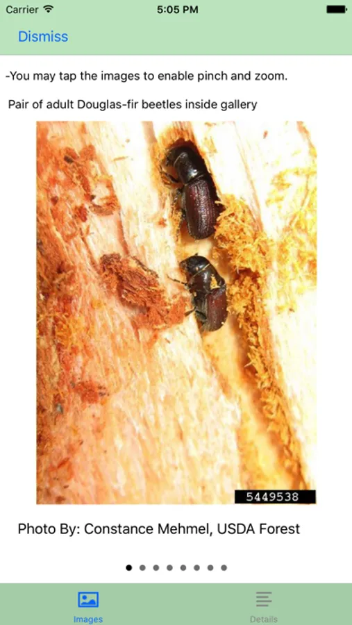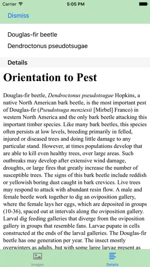 The photos present in this App are intended to help foresters, urban landscaping employees, or others working with trees recognize some of the common pest insects affecting trees in North America and understand their life cycles and how they damage trees. The information was drawn from book, websites, factsheets, and some original literature. This App is not a guide for specialists. In many groups, such as the bark beetles and aphids, confirmation of species identity requires attention to details not visible in photos with comparisons to other similar species and use of keys. Sources for further information (websites and articles) are given at the bottom of each species' page.