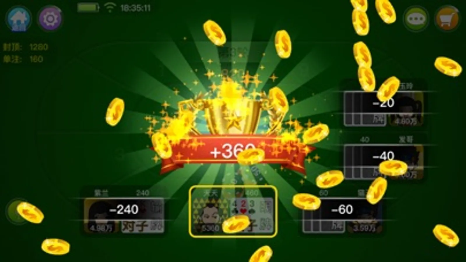 游戏:从庄家先开始下注,其他玩家依次逆时针操作。轮到玩家操作时,玩家根据条件和判断形势可以进行加注、跟注、看牌、放弃、开牌等操作。