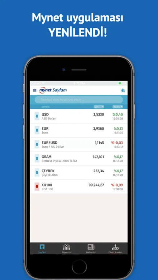 Türkiye’nin Lider Finans Uygulaması Mynet Finans’ı kullanarak; Hisse Senetleri, Borsa İstanbul Endeksleri, Canlı Borsa, Dünya Borsa Endeksleri, Emtialar, Dövizler, Altın Piyasası ve daha pek çok finansal veriyi canlı takip edebilirsiniz.