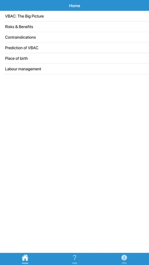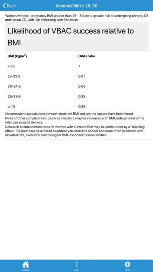 This app is designed for use in conjunction with the Association of Ontario Midwives' Clinical Practice Guideline No. 14: Vaginal Birth After Previous Low Segment Caesarean Section (2011). Users of the app are encouraged to refer to the clinical practice guideline for a complete analysis of the research relevant to VBAC and midwifery practice, along with full citations.