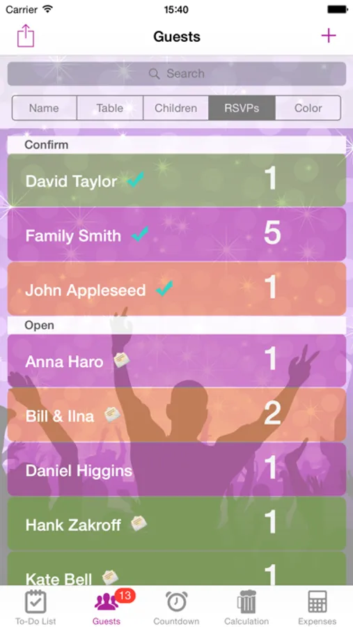 Design and processing of the guest list becomes child’s play with our app. Not only can the number of guests be constantly updated as needed, but using the three-color coded structure you can also determine categories for the visitors to your party (such as family, friends, etc).