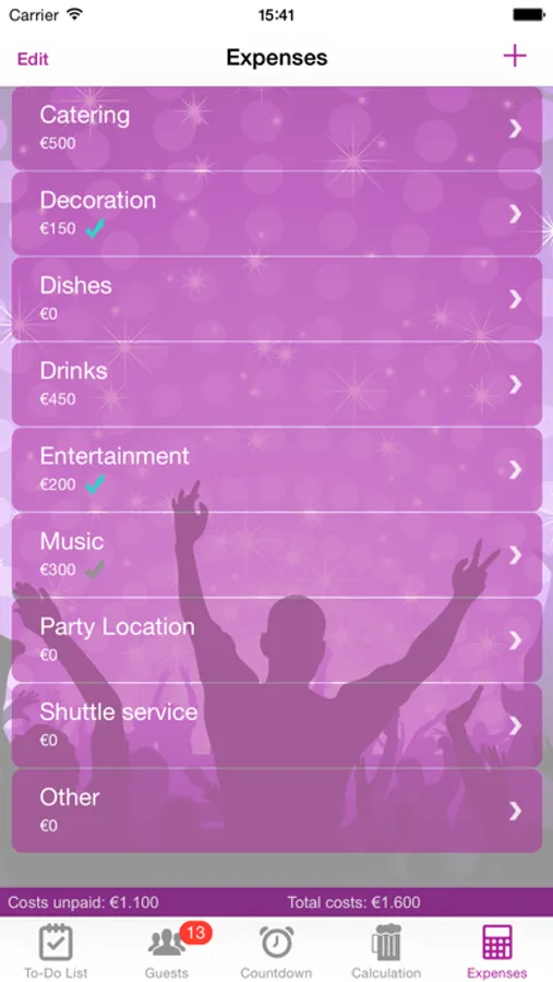 An integrated expense calculator allows you to maintain views of total cost, already fully and partially paid amounts as well as amounts still payable. Of course you can customize the expense planner by expanding or reducing the number of its categories.