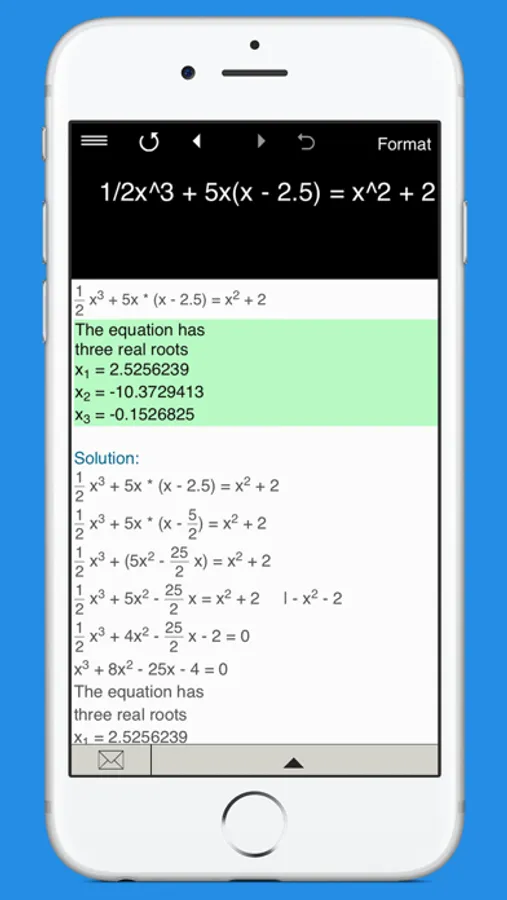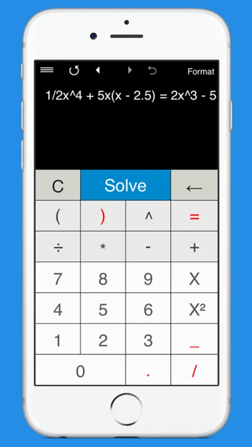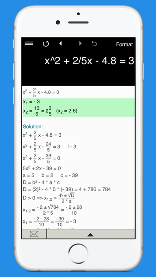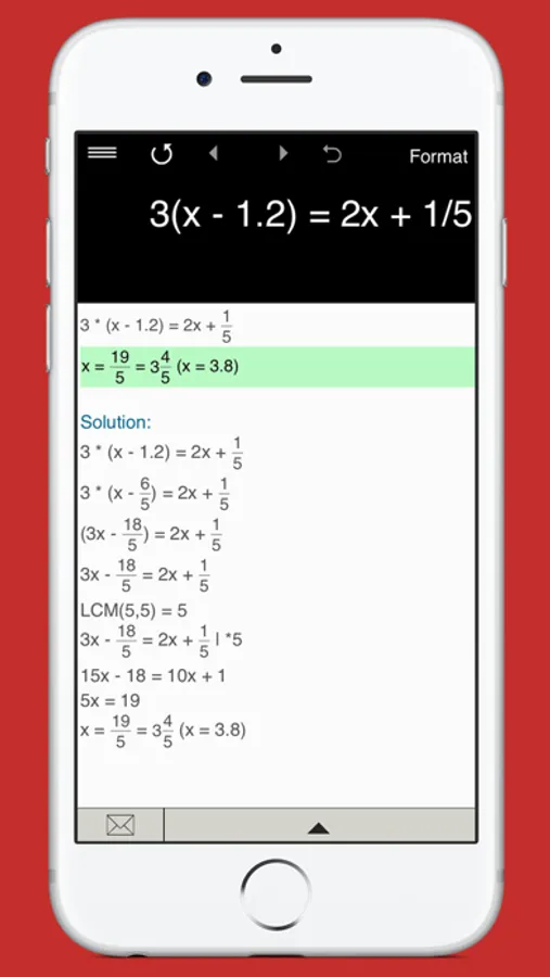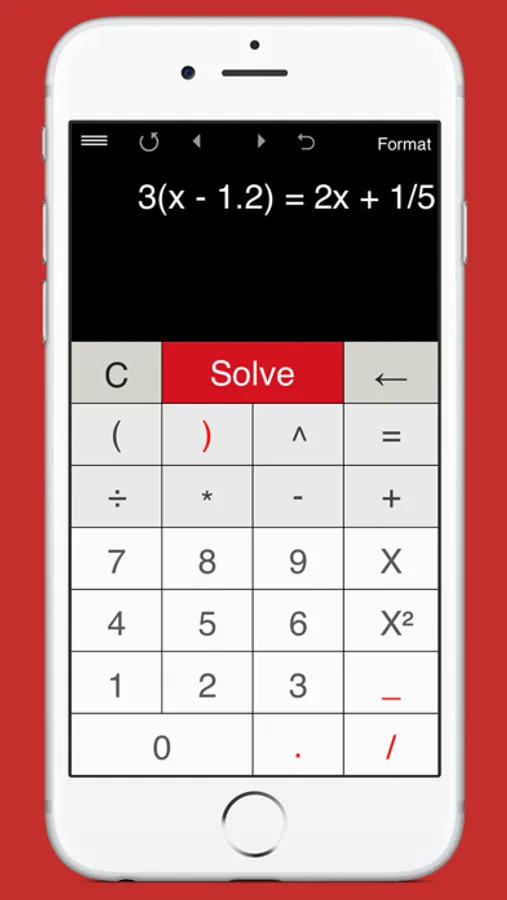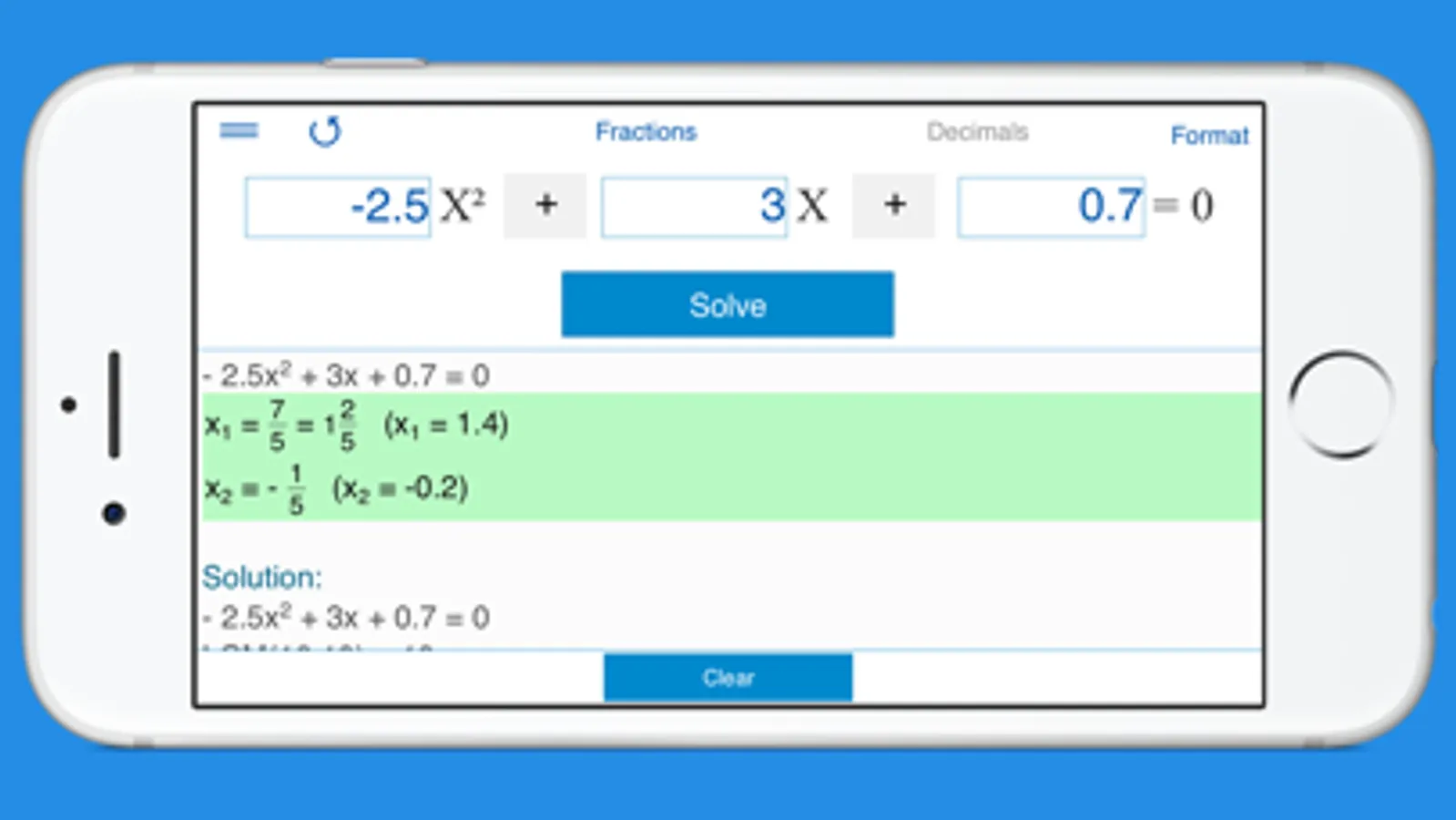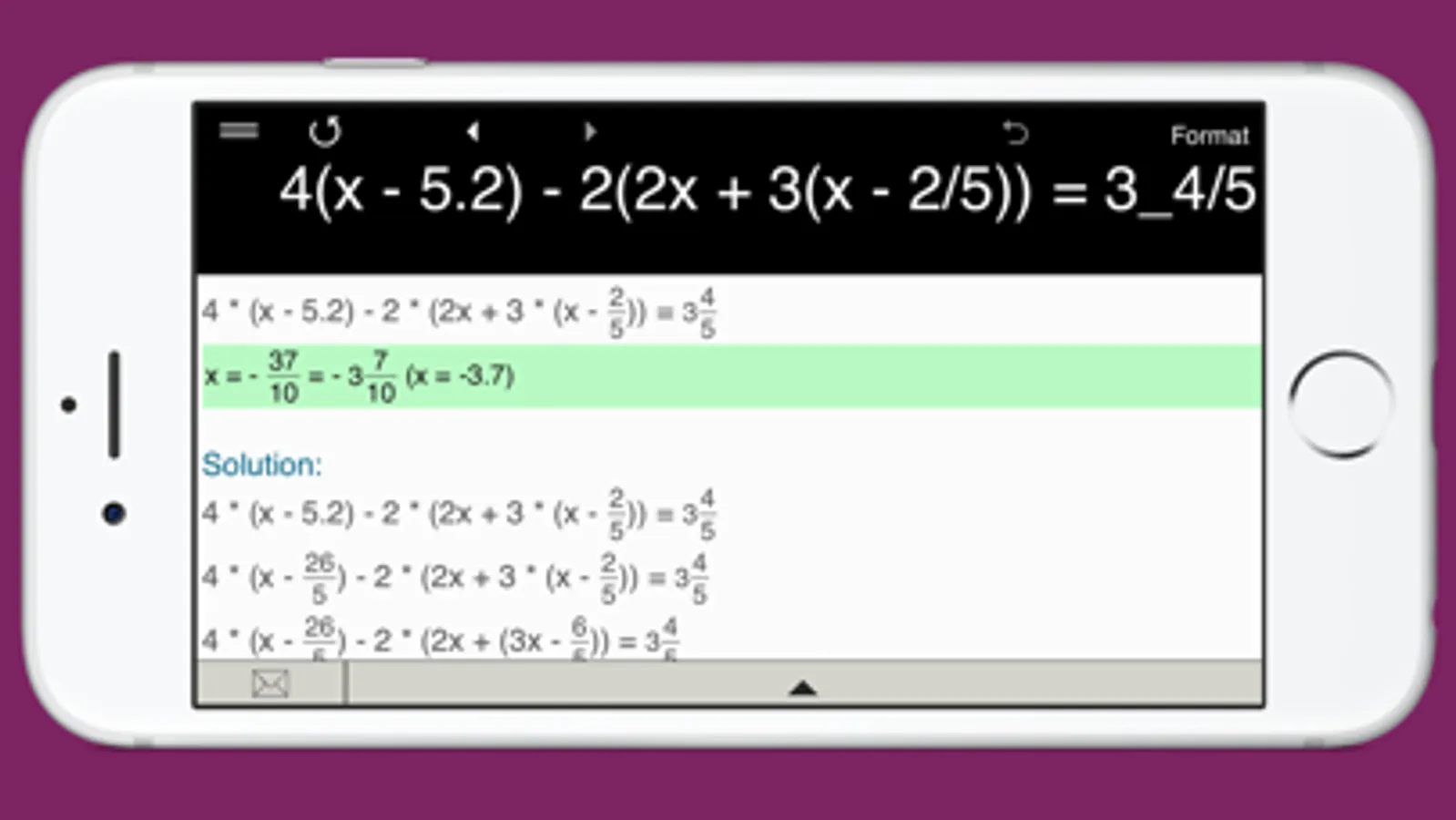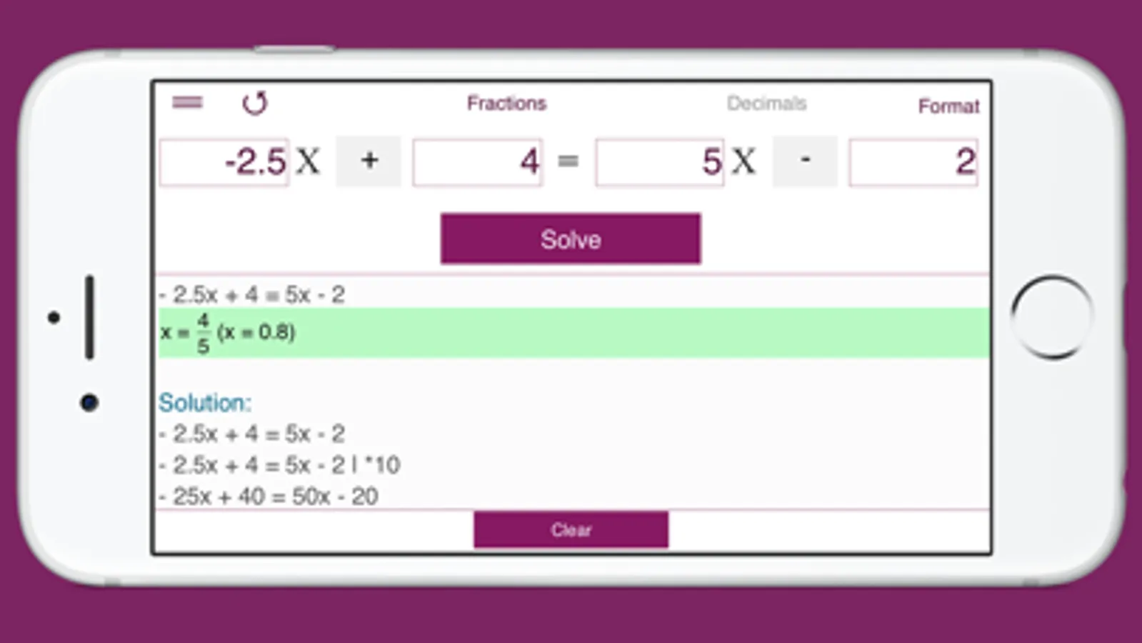 • Solves equations with fractions and parentheses. Note: the app doesn’t yet support equations with a variable in the denominator.