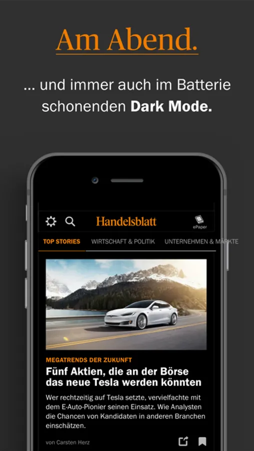 Schonen Sie Ihre Augen und Akku-Kapazität – lesen Sie die Handelsblatt App im Dark Mode. Die Artikel erscheinen dann mit heller Schrift auf dunklem Grund.