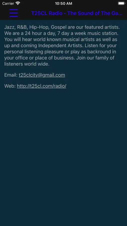 T25CL Radio is your radio station for various listening tastes. We feature Jazz, R&B, Blues, Gospel, Soul, West African and Hip-Hop Music. Some of our music comes from our own music artists at www.t25cl.com where you can download there music in MP3 formats. Please listen to our music radio station 24 ours a day 7 days a week. You never know what's going to play next. You can listen on your computer, tablet, Mobile Phone and coming soon Auto Play. Please feel free to comment on your listening pleasure. Thank you for listening.