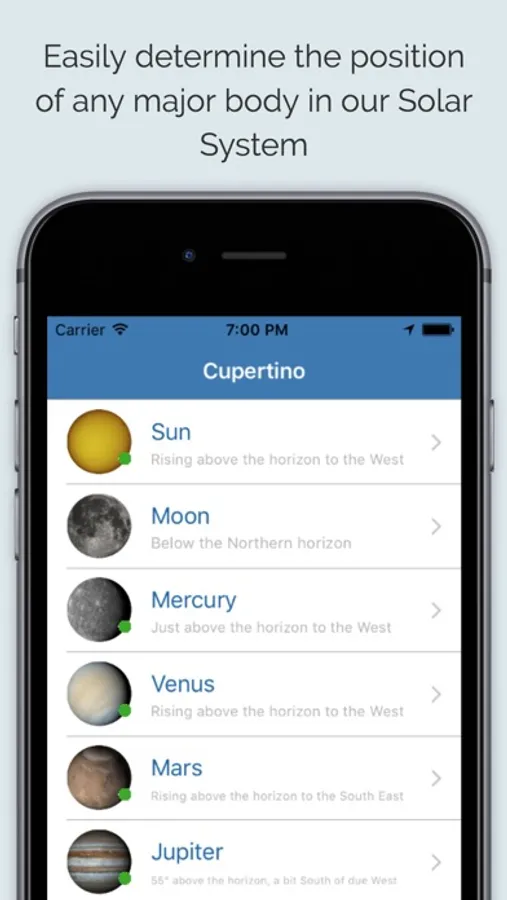Easily tell which the bodies that are currently above the horizon (the ones with the green icon), or learn more information about the body by clicking on it.