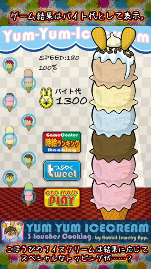 正解率に応じて、結果画面のアイスクリームが豪華になります。