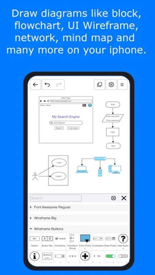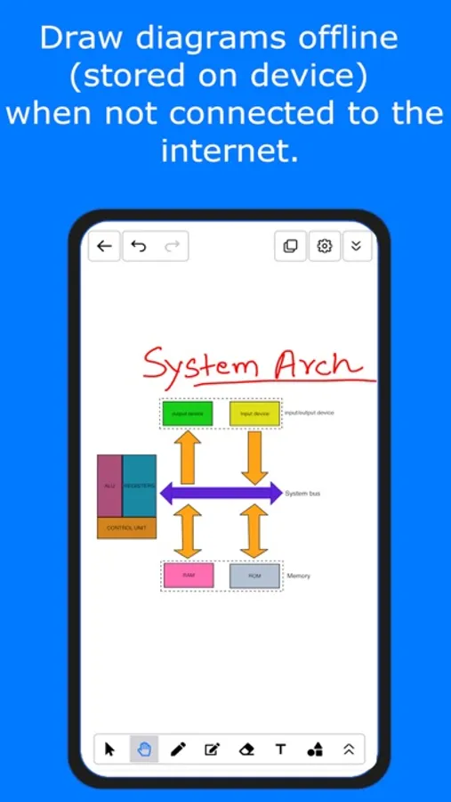 You can use the offline mode to draw diagrams. You can use smart drawing mode to simply sketch and get high quality diagrams like flowchart, block diagrams, system architecture and mindmaps. You can also drag drop shapes from the shape library to create diagrams like UML, Network, UI Wireframe, flow chart, organizational chart, business process diagram, venn diagram, mind maps and any kind of illustrations.