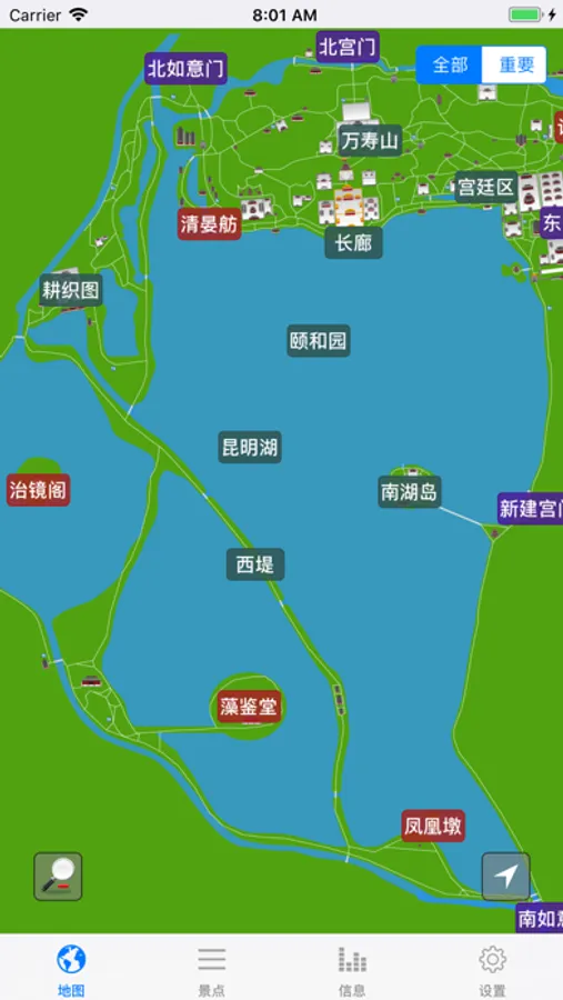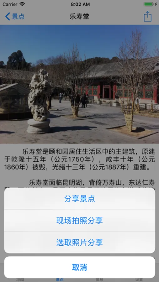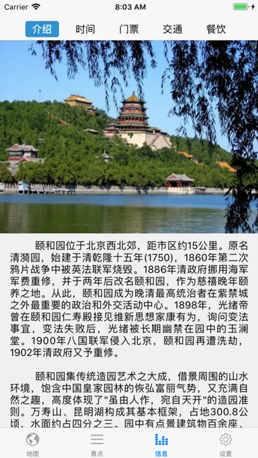 - 提供颐和园景区全部近100个景点的详细介绍,包括许多未开放和未恢复的景点。