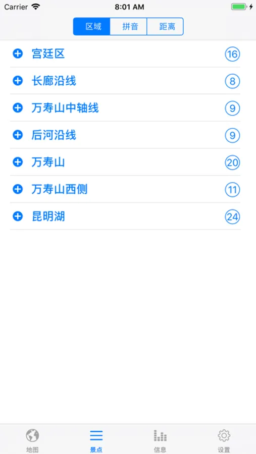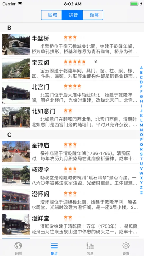 - 列表方式支持按区域、按拼音和按距离查看景点介绍。