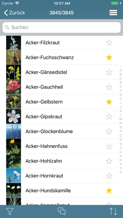 Die Artenliste erlaubt ein Stöbern und Suchen in den Arten, wahlweise mit den deutschen oder lateinischen resp. französischen oder lateinischen Artnamen, wobei die Liste alphabetisch oder nach Buchnummer geordnet angezeigt werden kann. Mit dem Filter kann die Artenliste nach gewünschten Merkmalen wie Blütezeit, geografische Verbreitung oder anhand der Familien und Gattungen eingegrenzt werden.