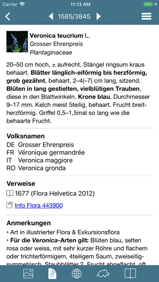 Die Flora Helvetica Pro App enthält Bilder und Artporträts von mehr als 3300 in der Schweiz wachsenden Pflanzen und erlaubt mit zwei verschiedenen Bestimmungsschlüsseln das Bestimmen der Pflanzen. Sowohl der bewährte dichotome Schlüssel wie auch ein Multikriterienschlüssel stehen zur Verfügung. Im Multikriterienschlüssel wird das Bestimmen anhand einfacher Merkmale möglich.