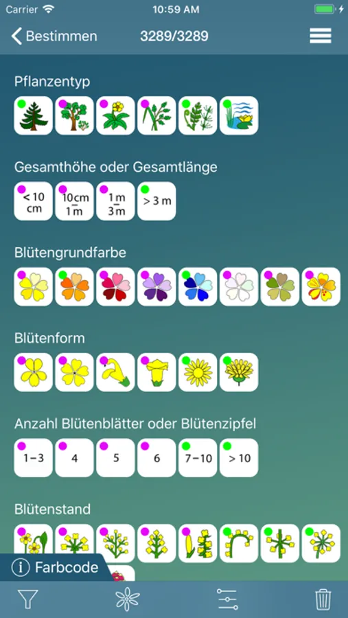 Dynamischer Multikriterienschlüssel: Durch Auswahl und Kombination von Merkmalen wird die Artenliste verkleinert. Je genauer die Art mit Merkmalen beschrieben werden kann, desto genauer ist die Bestimmung. Farbige Punkte geben jeweils an, wie gut sich ein Merkmal für das Eingrenzen der Arten eignet.