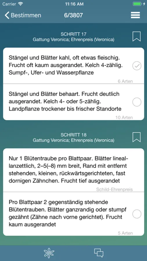 Dichotomer Schlüssel: dieser ist nach dem botanisch üblichen dichotomen Schema aufgebaut: Zwischen je zwei aufgeführten Merkmalen ist das auf die zu bestimmende Pflanze zutreffende auszuwählen, bis ein Artname erscheint. Wer bei einem Entscheid unsicher ist, kann Lesezeichen anbringen, um bequem zur entscheidenden Frage zurückzufinden. Jederzeit kann die Liste der noch in der Auswahl verbleibenden Arten angesehen werden.