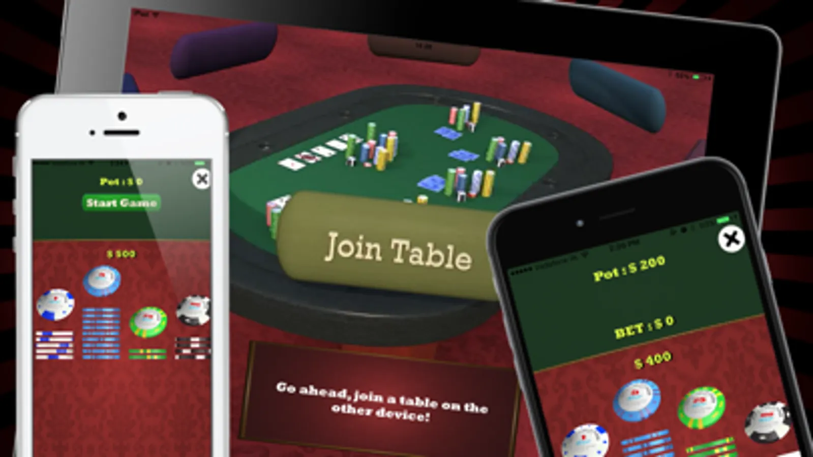 See your chips move from your device onto the table, see your cards be revealed. All the tension of regular poker, where you can look your opponents in the eye. But all the score keeping, rules and dealing are being handled for you by your devices.
