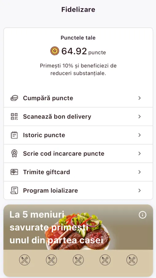 Descarcă aplicația, înregistrează-te și la fiecare vizită în unul dintre restaurantele afiliate sau la comenzile cu livrare vei putea încarca în cont 10% din valoarea notei, sub formă de puncte, 1 punct = 1 leu (ex: la o notă de 100lei, vei salva în cont 10 puncte, echivalentul a 10 lei). La următoarea vizită vei putea achita nota de plată total sau parțial cu punctele strânse în contul tău. Punctele pot fi folosite si la comenzile cu livrare.