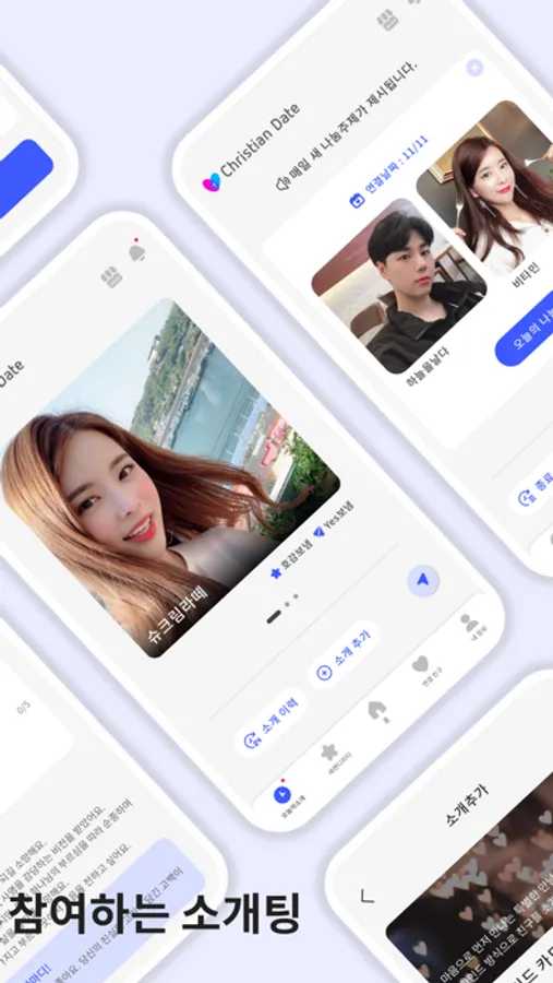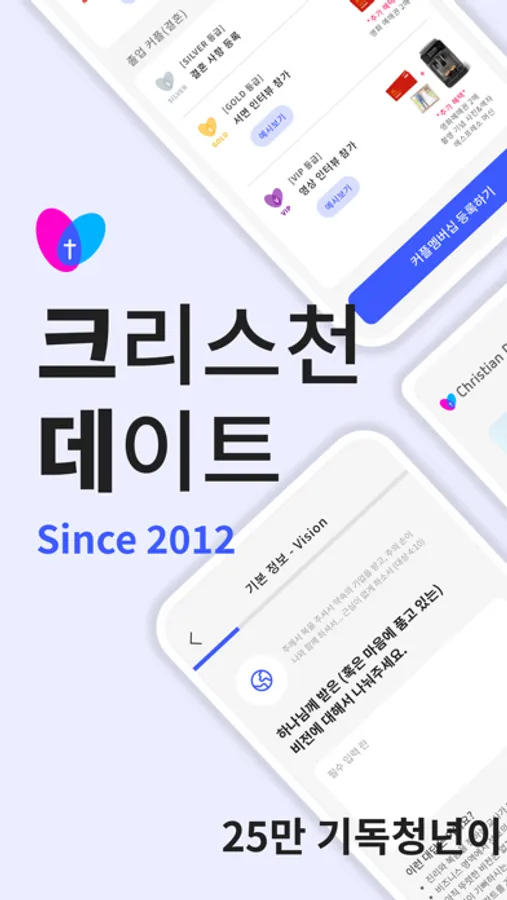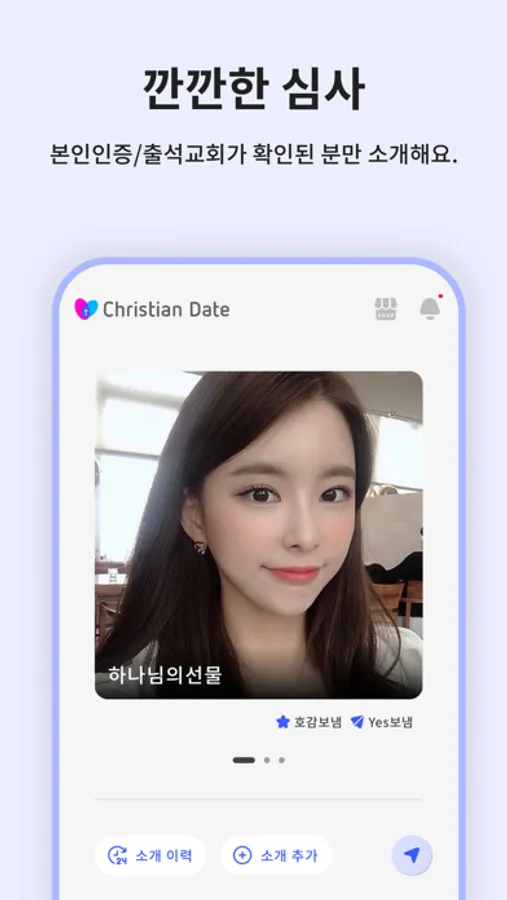 '크리스천데이트'는 신앙관이 유사한 다른 교회의 청년들을 IT기술이 접목된 시스템을 통해 안전하게 소개받을 수 있는 좋은 만남의 통로입니다.