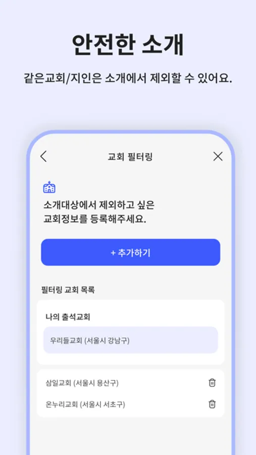 서로의 ‘실명’, ‘연락처’, ‘출석교회’가 공개되고, 최대 30일동안 신앙,재정,비전에 대한 다양한 대화주제가 제공돼요.