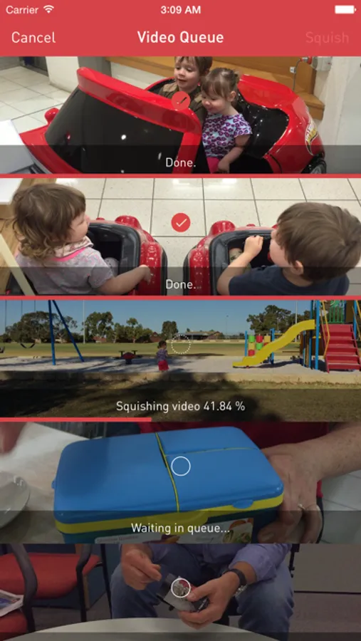 3. Tap "Squish" and leave Video Squishy to re-encode the video queue. It will save the new compressed versions back to your camera roll.