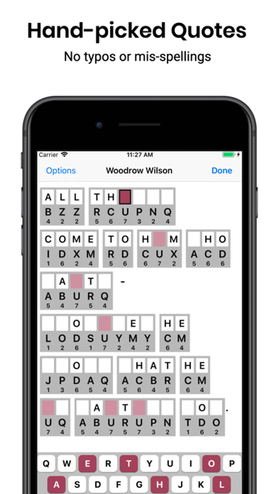 The quality app for serious cryptogram / cryptoquip solvers with no ads or nags. Designed from scratch for fast play, this cryptogram app allows you to concentrate on solving the puzzle. The quotes are hand-curated and carefully validated to be error free. The result is pure puzzle solving fun with no typos, ads or distractions!