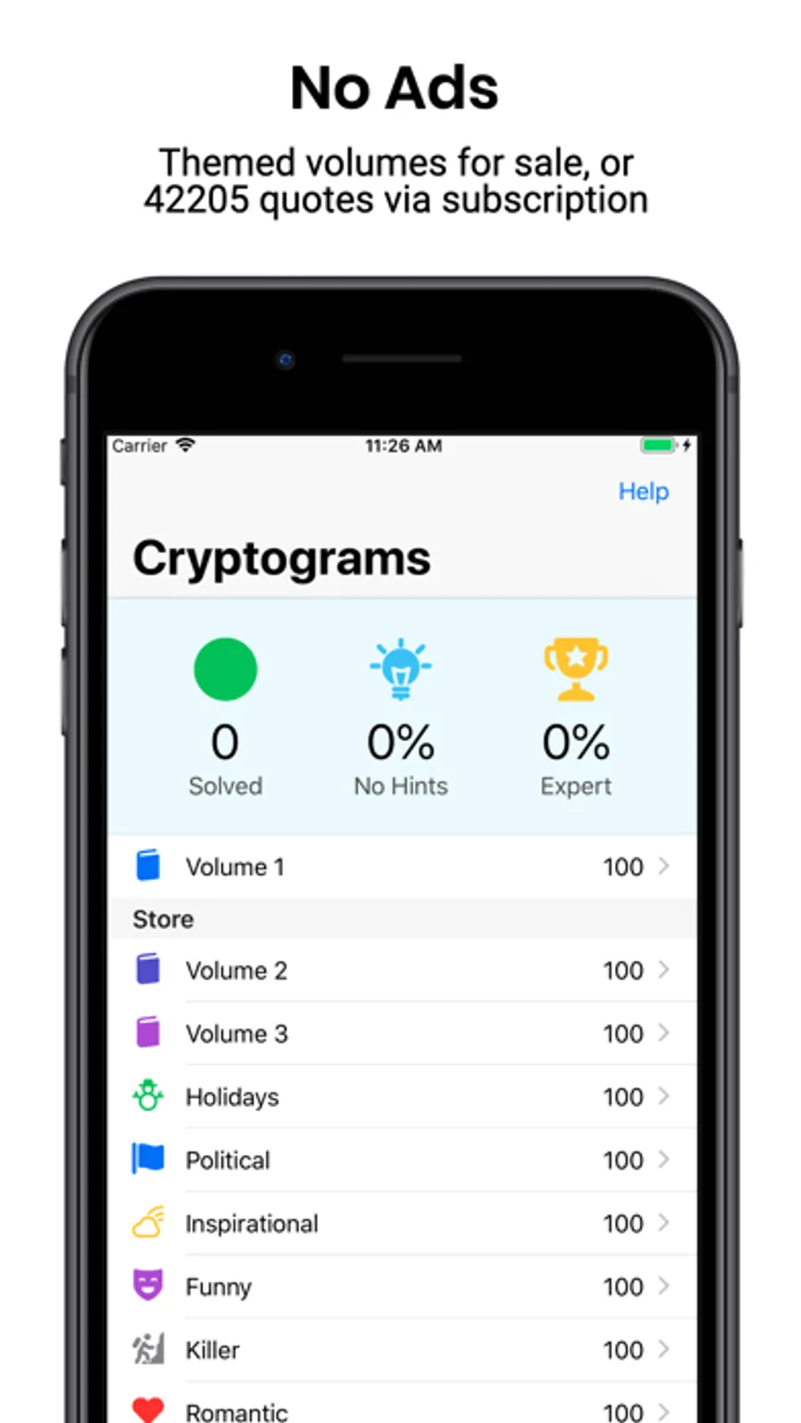 Nine more puzzle packs, each with 100 puzzles in various themes like Funny, Inspirational and Killer cryptograms are available for in-app purchase. These will provide HOURS and HOURS of fun!