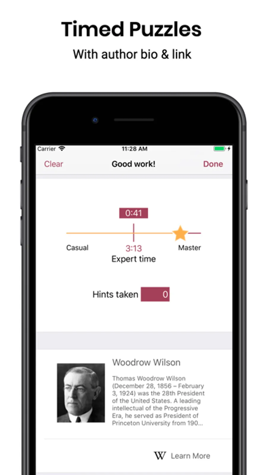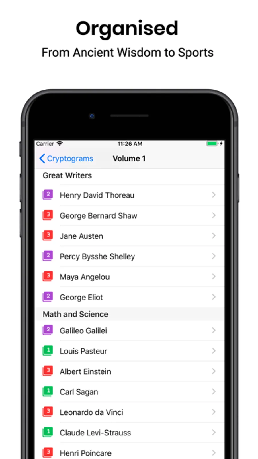 The one hundred hand-picked cryptogram puzzles are organized into ten popular categories like Ancient Wisdom, Celebrities, Comedy, Philosophy, Politicians and Sports. When you finish the puzzle, you'll see how your time compares to expert cryptogram puzzlers and the number of hints taken if any. There is also a short description of the author and a link to Wikipedia find more information.