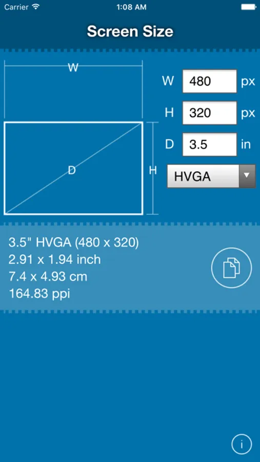 Enter screen size in pixel and diagonal in inch, and then you will get screen size in inch/cm, resolution in ppi, and common aspect ratios such as 16:9 (full version only).