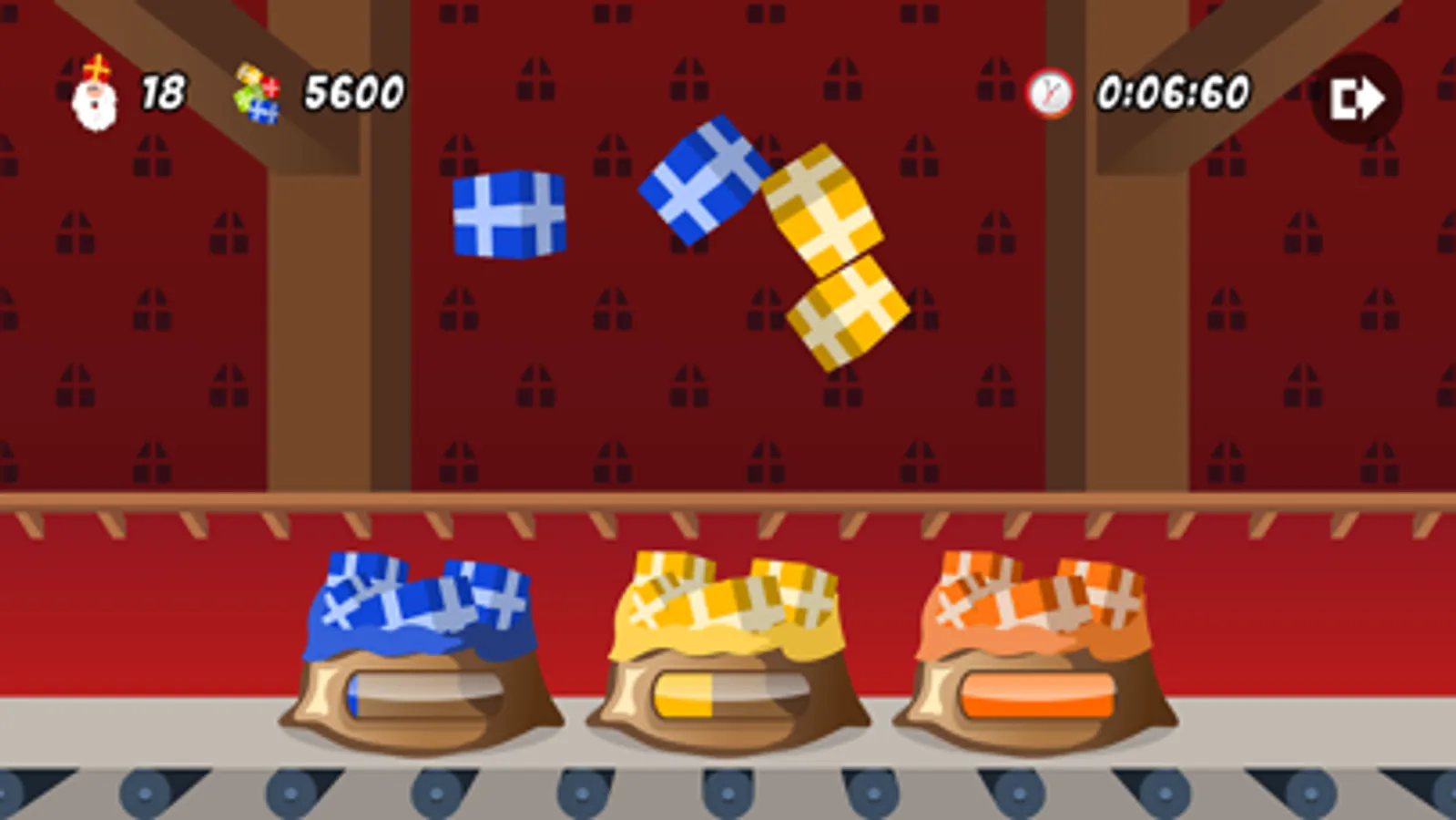 Oh nee! De inpakmachine van Sinterklaas is kapot. Alle cadeautjes vliegen in het rond. Jij moet zorgen dat de cadeautjes in de juiste zakken terecht komen.