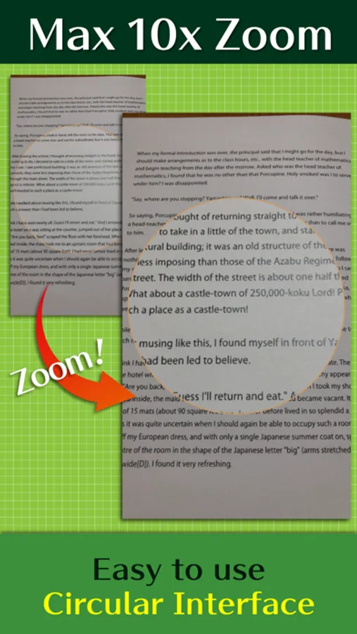 The magnification can be adjusted smoothly up to 10x. A circle is displayed in the center of the screen, and the magnified image is displayed inside it. The circle can be moved to any position or displayed in full screen.
