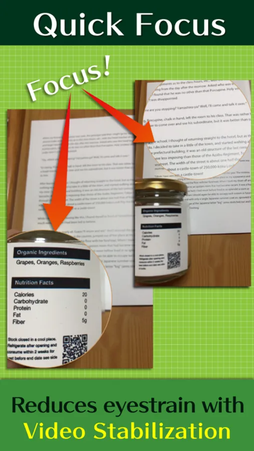 Magniscope supports your vision with its intuitive user interface. You can start using it without any complicated settings. Handy when reading hard-to-read things like books printed in small letters, menus in restaurants, labels on the medicine bottles, etc.