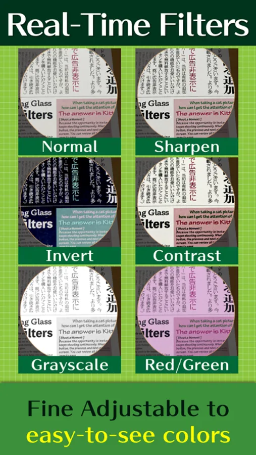 Magniscope features special live filters to make it easier to see the magnified image. You can turn on the sharpening filter to display text clearly. It is also possible to easily distinguish colors by using various color filters such as contrast adjustment, inversion, and monochrome.