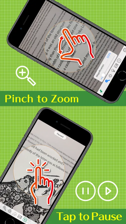 - Paused screen is useful for displaying newspapers, maps, pamphlets, etc. When the entire area you want to see is displayed, tap the circle. You can then zoom in anywhere on the screen without moving the device.