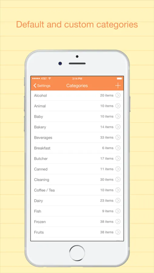 ⁃ Default items under categories and you can add your own custom ones.