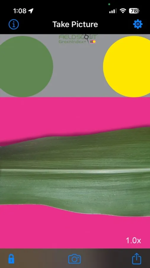 1. Using GreenIndex+, take a picture of a leaf lying across the target board.